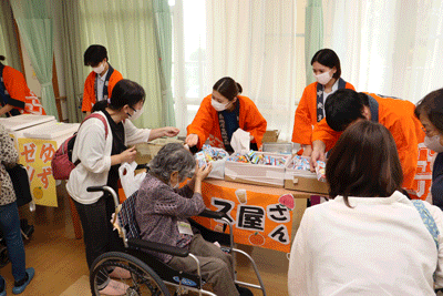 「JAしみず興津女性部様の農作物」、「宮様まんぢう本舗 潮屋様の宮様まんぢう」、「創作パン工房 ベイクドハート様のパン」、「お好み焼き」、「ちらし寿司」、「お菓子つり」、「ジュース」、「ゼリー」、「バザー」など様々なお店が並び、利用者様やご家族様は、好きなお店に並んで買い物を楽しまれました。